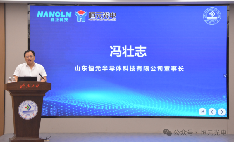 在上午的学术委员会会议上,济南大学校领导、省教育厅科技处有关负责同志以及济南晶正电子总裁胡文相继做了发言并致辞。随后,山东恒元半导体科技有限公司董事长冯壮志先生上台发言。冯总在发言中指出,恒元光电的创立源于与济南大学铌酸锂晶体研究领域的专家、学者,与济南晶正两位胡总的相识和志趣相投。公司创立四年来,有效承接了铌酸锂晶体的产业化,不断精进铌酸锂晶体的生长、加工等各个环节,充分实现了基础科学与市场应用之间的桥梁纽带作用。