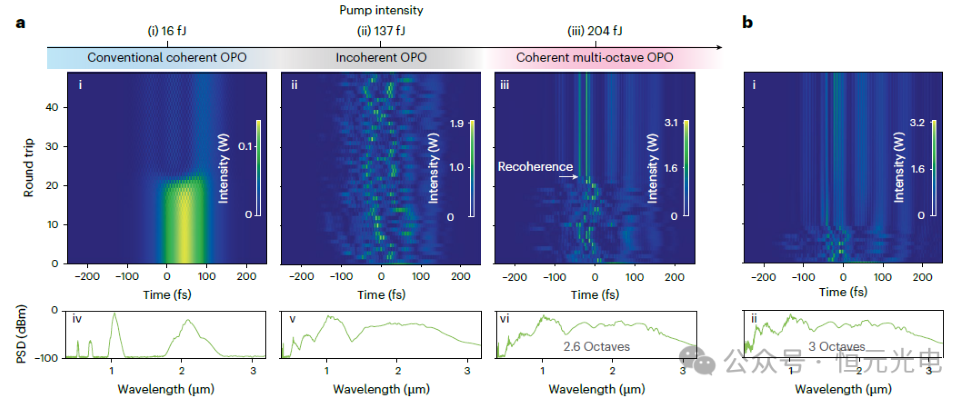 图3 模拟结果显示了纳米光子OPO的不同操作模式。a、当泵浦能量增加时,从(i)近阈值相干操作到(ii)非相干操作和(iii)回到相干操作的转变。b,三倍频程相干OPO。