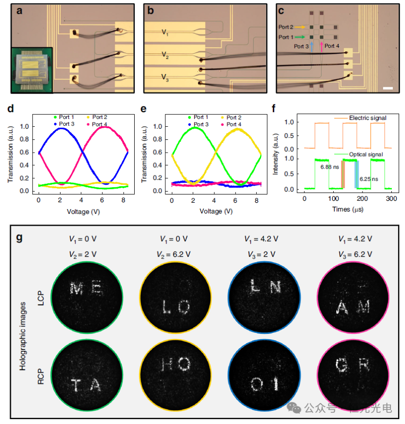 图4 LN MZI开关启用的动态全息显示器的特性。由(a)光栅耦合器、b施加电压V1、V2、V3的两级LN MZI开关和(c)OCMN组成的制造样品的图像。