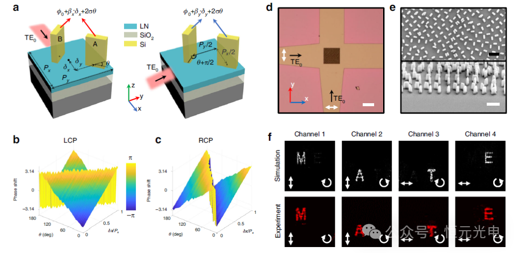 图2 片上元表面的设计。基于几何相位和迂回相位的双原子结构相位调制原理。(b)左圆极化(LCP)和(c)右圆极化(RCP)输出通道的模拟相移图。d LN波导交叉顶部制造的片上超表面的光学显微镜图像。e 片上超表面的扫描电子显微镜图像。f 使用LCP和RCP分析仪在TE0模式照明下沿x和y方向模拟和测量四通道全息图像。