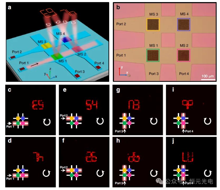 总之,该团队提出了在LNOI平台上具有改进的多路复用能力的动态全息显示的快速调制策略。通过几何相位和迂回相位的联合相位调制,利用改进的G-S优化算法,设计了一个双原子多路复用片上元表面作为寻址单元。作为扩展,通过切换不同的输入端口和偏振分析器,建立了一个由2×2 WCA促进的OCMN,用于在八幅全息图像之间进行可寻址操作。
