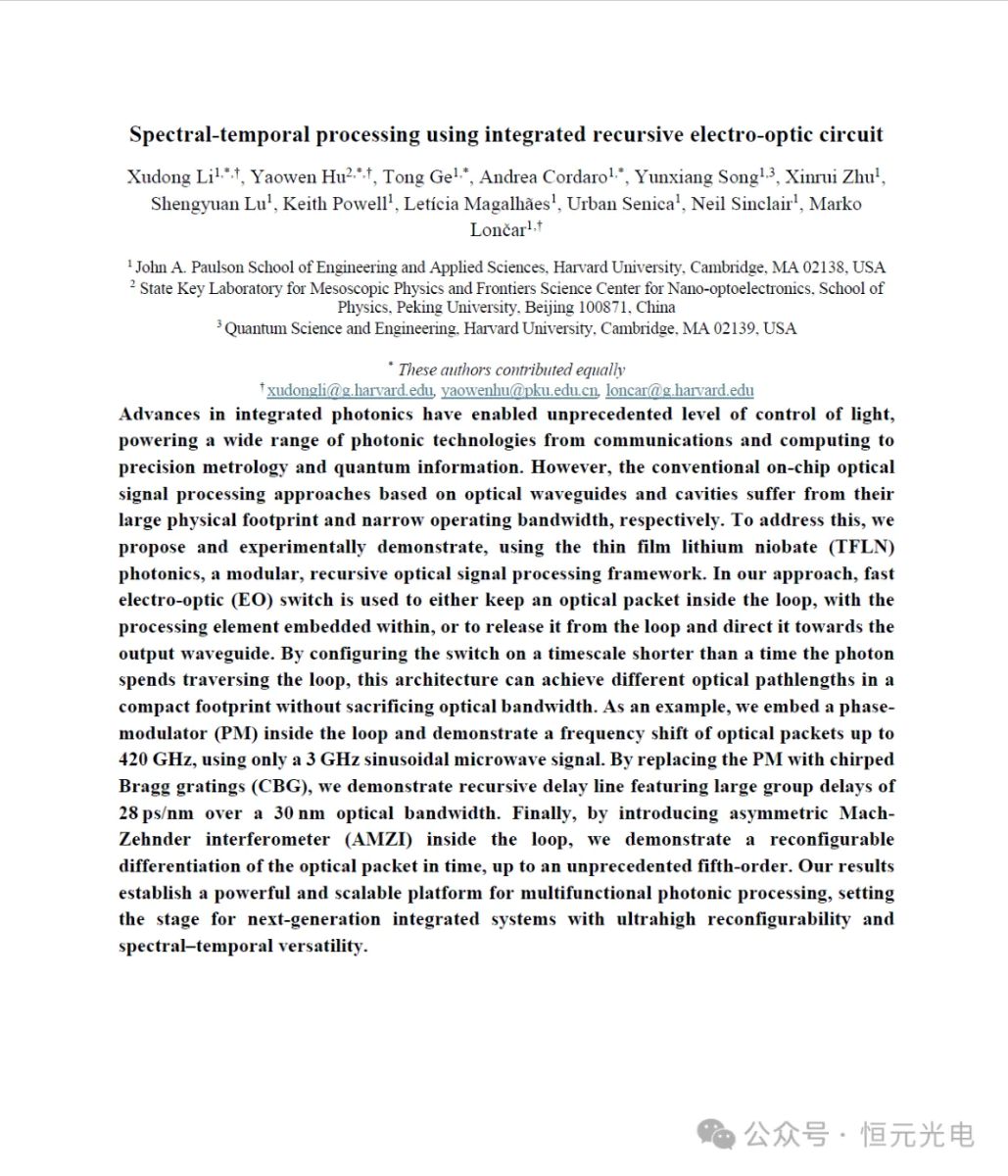 集成光子学的进步实现了前所未有的光控制水平,为从通信和计算到精密计量和量子信息的各种光子技术提供了动力。然而,基于光波导和腔的传统片上光信号处理方法分别受到其大物理占地面积和窄工作带宽的影响。近日,哈佛大学Marko Lončar课题组使用薄膜铌酸锂(TFLN)解决上述问题。该团队使用快速电光(EO)开关将光包保持在环路内,处理元件嵌入其中,或者将其从环路中释放并将其引导到输出波导。这种架构可以在紧凑的占地面积 内实现不同的光路长度,而不会牺牲光带宽。具体内容以“Spectral-temporal processing using integrated recursive electro-optic circuit ”为题发表。