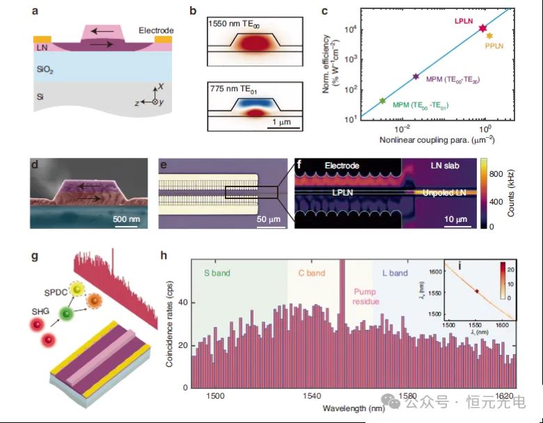 图1用于高效光子对生成的层极化铌酸锂(LPLN)纳米光子波导。x切TFLN中LPLN波导横截面示意图。暗粉色和浅粉色表示相反的域极性。b MPM的TE00模式在1550nm和TE01模式在775nm的模式分布(Ez分量)。c不同非线性TFLN波导方案之间归一化SHG转换效率的理论比较,蓝线是归一化SHG效率与非线性耦合参数的关系。e制造的LPLN波导的俯视光学显微照片。f LPLN波导的俯视激光扫描SHG成像。g用于光子对生成的级联SHG-PDC工艺示意图。h从1486 nm到1625 nm测量的重合光谱,覆盖电信S、C和L波段。i光子对的联合光谱强度。
