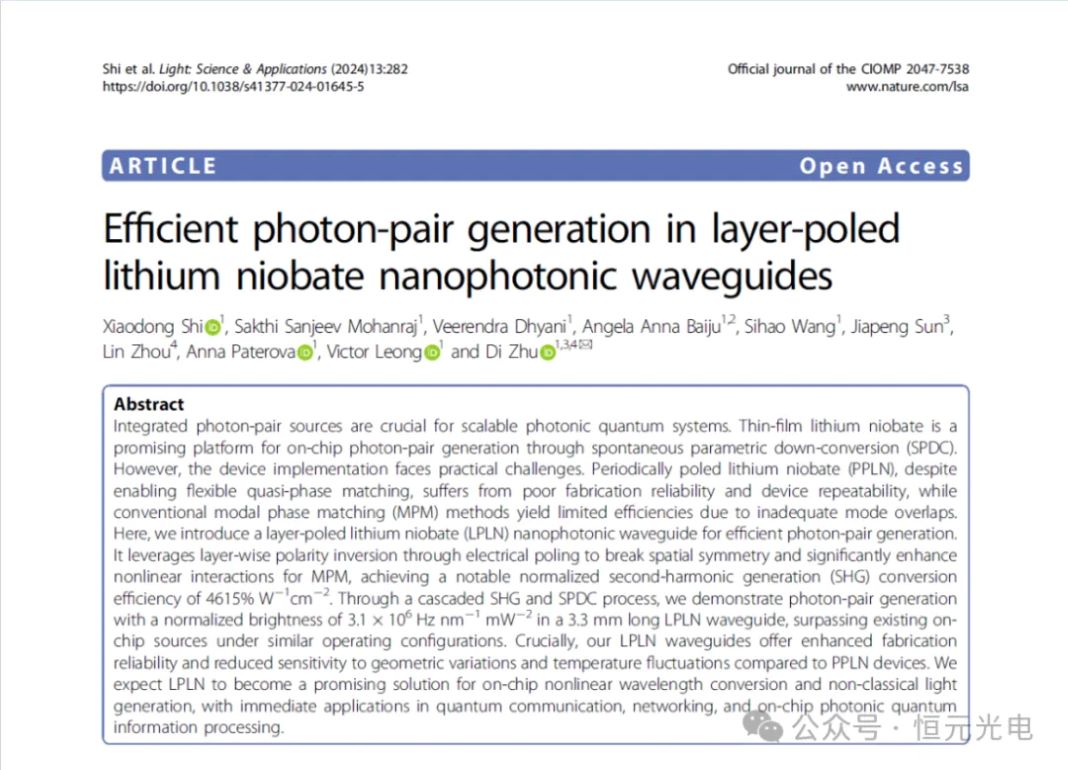 近日,来自新加坡国立大学和新加坡科技研究局的朱迪教授团队研发了一种分层极化铌酸锂(LPLN)纳米光子波导。这种新型LPLN波导通过电极化利用逐层极性反转来打破空间对称性,并显著增强模态相位匹配(MPM)的非线性相互作用,实现4615%W−1cm−2的显著归一化二次谐波发生(SHG)转换效率。该研究工作以“Efficient photon-pair generation in layer-poled lithium niobate nanophotonic waveguides”为题发表在Light: Science & Applications。