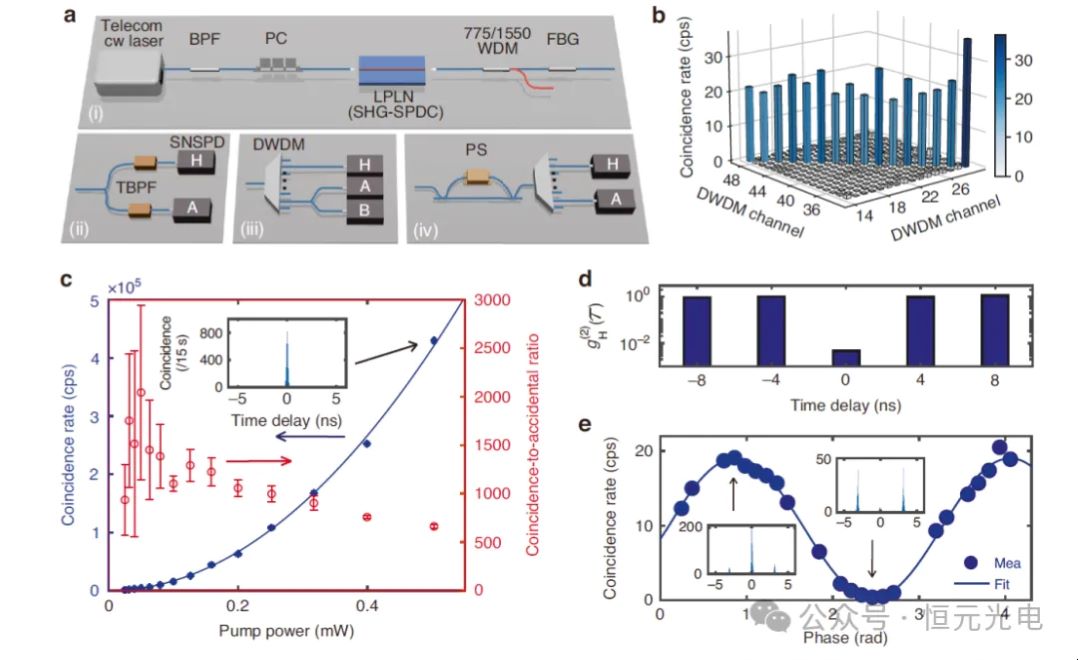 图3使用级联SHG-PDC方案对LPLN纳米光子波导中光子对生成的非经典表征。a实验装置。b通过在32个DWDM信道(ITU频率Ch14-Ch29和Ch48-Ch33)上的相关性测量构建的联合光谱强度。c测量的(蓝点)和二次拟合的(蓝线)片上光子对生成率和重合意外比(红色)是片上泵浦功率的函数。d表示在0.5 mW的泵浦功率下在不同时间延迟下测量的二阶相关函数。e在0.5 mW的泵浦功率下测量的双光子干涉,测量的可见度为98.0%。