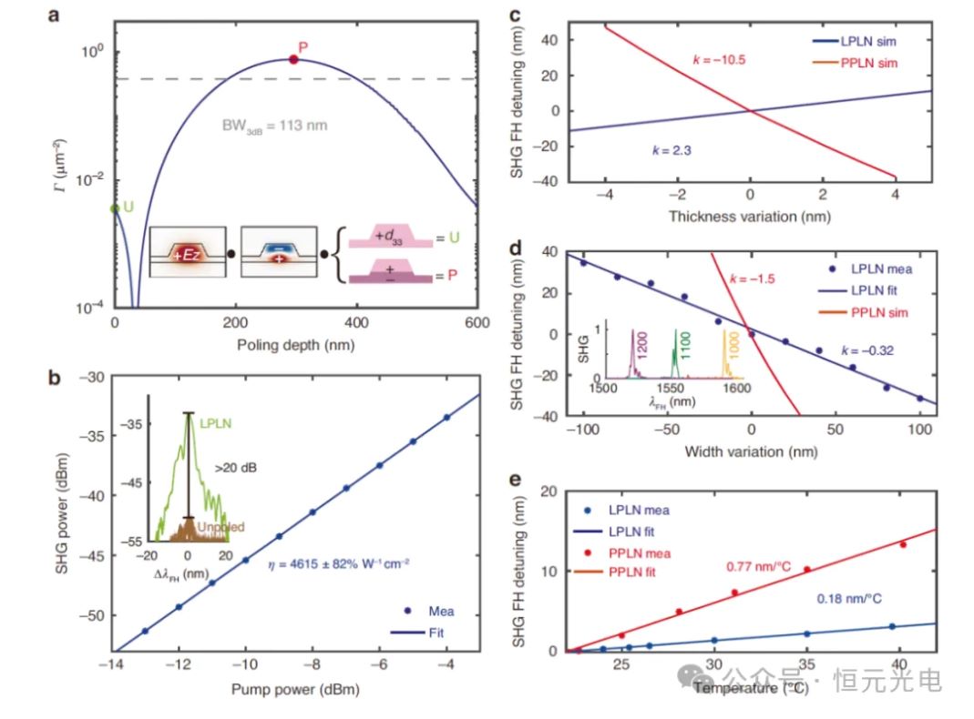 图2非线性LPLN纳米光子波导的数值分析和经典测量。a作为极化深度函数的数值计算的非线性耦合参数(Γ)。b在2.5mm长的LPLN波导中测量的SHG功率与泵浦功率的函数关系。插图:LPLN波导(绿色)和参考无波导(棕色)的归一化SHG光谱,显示差异>20 dB。c模拟LPLN波导(蓝色)和类似PPLN波导(红色)中TFLN厚度变化(标称厚度=600nm)的相位匹配波长偏移(FH)。它d LPLN(蓝色)和PPLN(红色)波导的相位匹配波长偏移(FH处)是波导宽度变化(标称宽度=1100 nm)的函数,分别显示灵敏度为-0.32和-1.5。e测量的LPLN(蓝色)和PPLN(红色)波导的相位匹配波长偏移(在FH处)与温度的函数关系,显示拟合的温度灵敏度分别为0.18 nm/°C和0.77 nm/°C