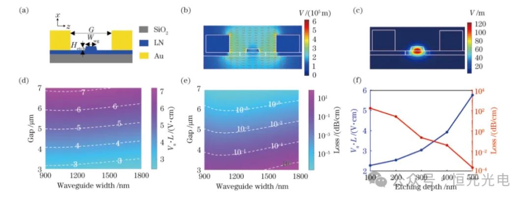 图2 X 切TFLN 电光波导仿真结果。(a)波导截面示意图;(b)静电场模式;(c)TE00光模场分布;(d)VπL 和(e)金属吸收损耗随波导宽陈度和电极间距的变化情况;(f)VπL 和金属吸收损耗随刻蚀深度的变化情况