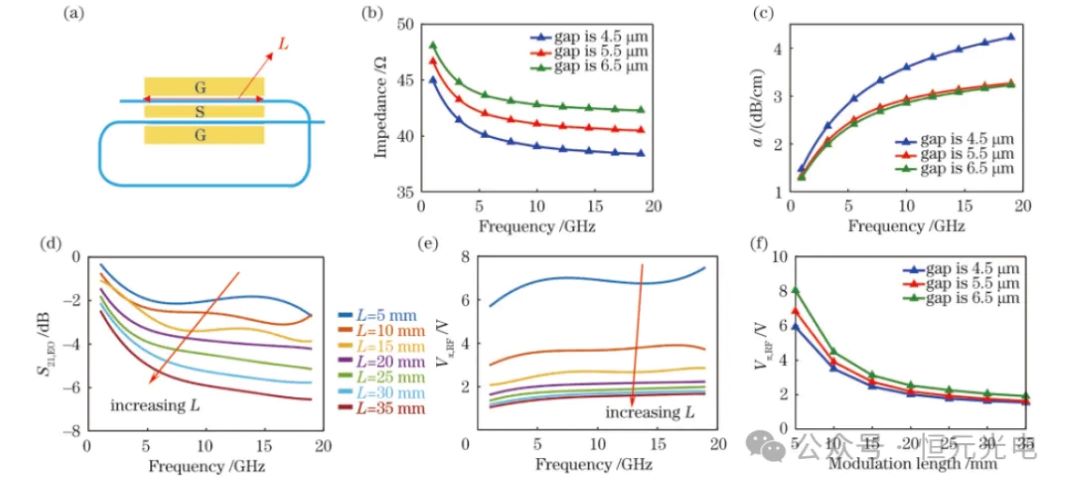假设在每个频率点下都满足理想的相位累积调制条件,进一步分析了调制长度(L)对交叉型相位调制器S21,EO 和射频半波电压的影响。此时G 固定为5. 5 μm,L 从5 mm 改变至35 mm(间隔为5 mm),结果如图3(d)和(e)所示。当L15 mm 时,行波电极累积的微波传播损耗成为了影响S21,EO 的主要因素,其影响程度远大于阻抗失配,因此S21,EO 曲线整体下降并趋于平缓,阻抗失配波动消失。从仿真结果可知,L 较长使得调制相位累积较大,此时Vπ 较低,但是传播损耗较高,因此Vπ ,RF在所计算的频段内缓慢上升。当L>20 mm 时,Vπ ,RF 变化将不明显。