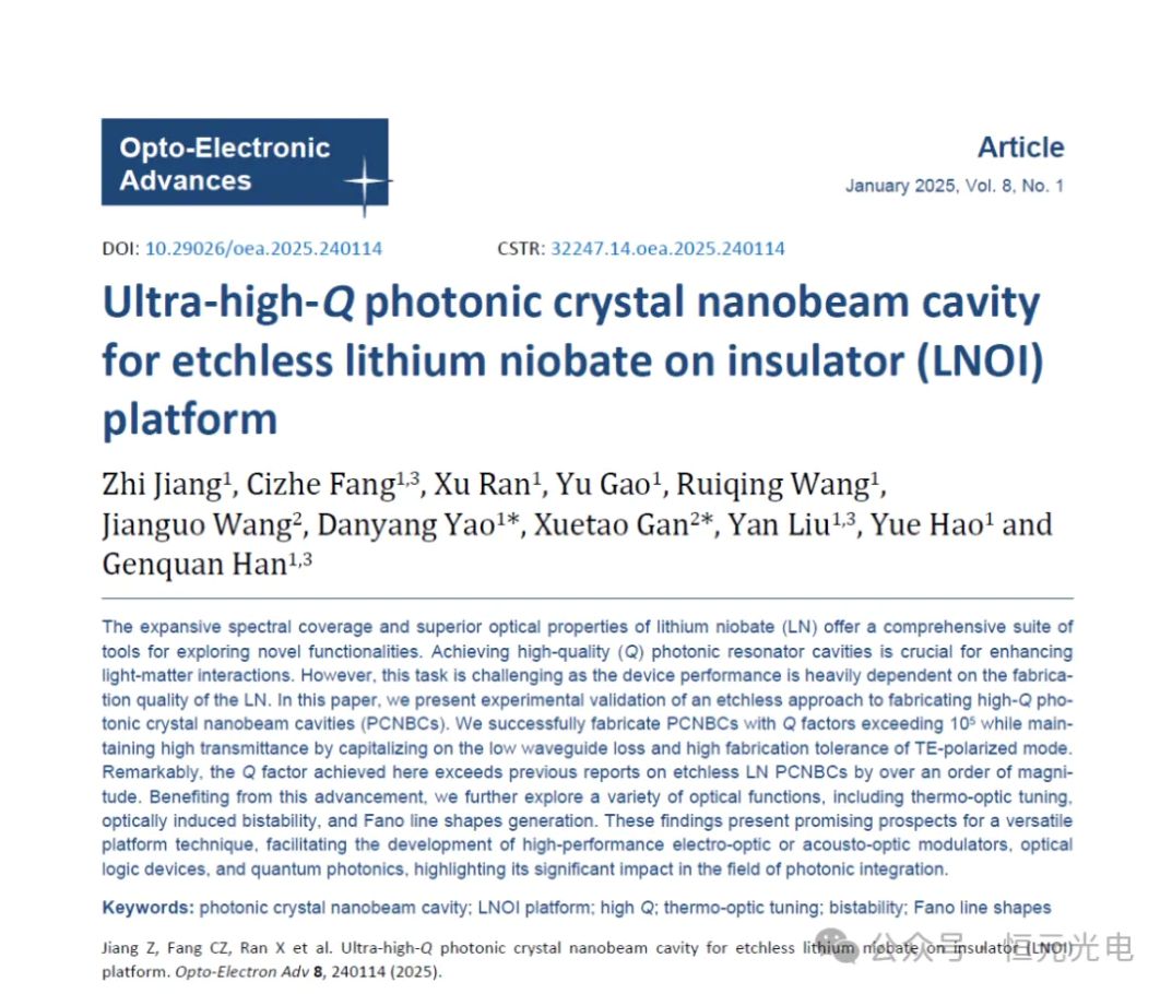 铌酸锂(LN)的广泛光谱覆盖和优越的光学性能为探索新功能提供了一套全面的工具。实现高质量(Q)光子谐振腔对于增强光-物质相互作用至关重要。然而,这项任务具有挑战性。近日,经过西安电子科技大学的姚丹阳副教授和西北工业大学的甘雪涛教授的深入研究,在LNOI平台上取得了超高品质因子光子晶体纳米束腔(PCNBC)的设计、制备及光子高效操控方面的重大进展,相关成果以“Ultra-high-Q photonic crystal nanobeam cavity for etchless lithium niobate on insulator (LNOI) platform”为题发在《Opto-Electronic Advances》上。