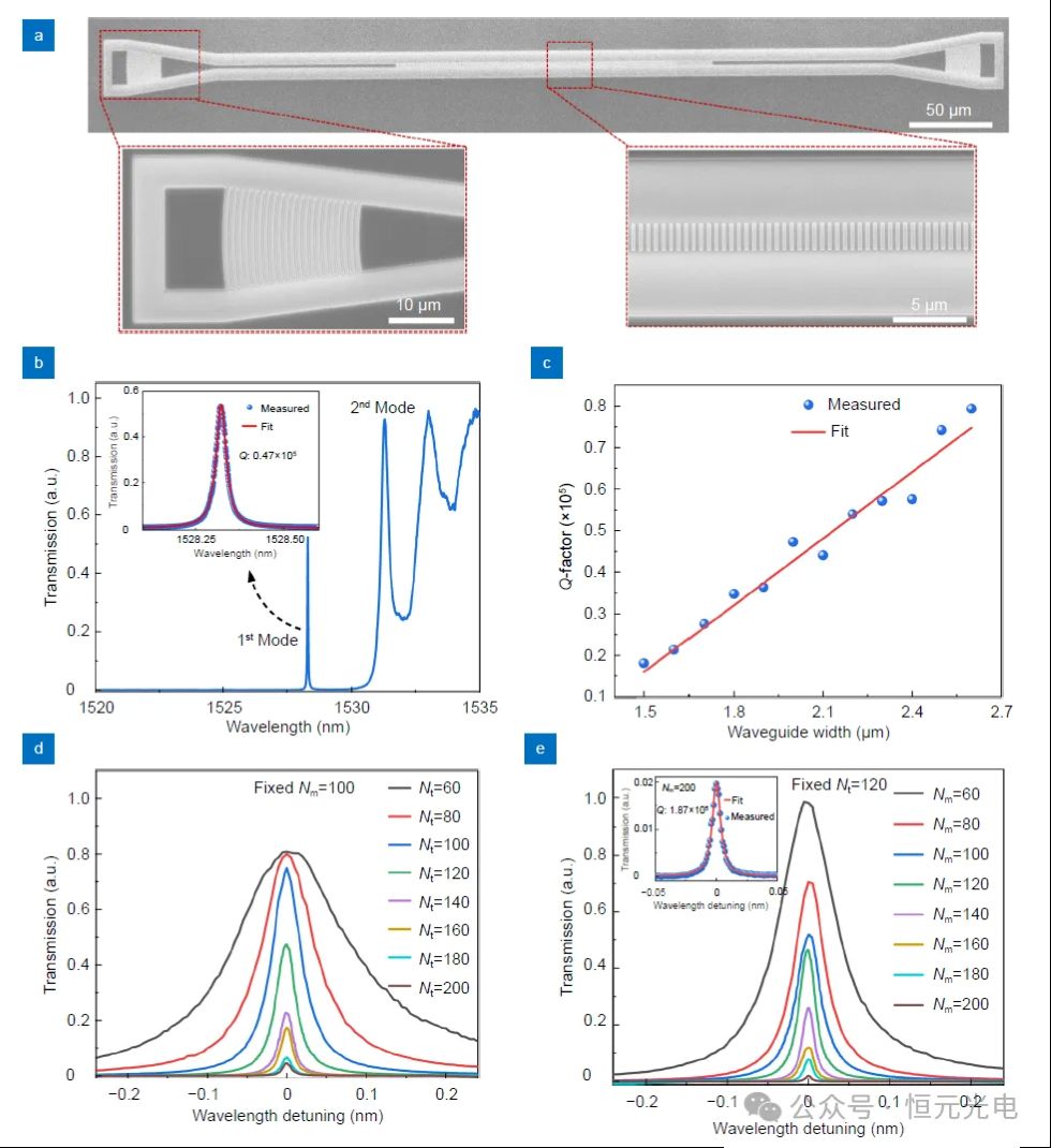 图3(a)所制备的PCNBC的SEM图像。底部插图分别显示了光栅耦合器(左)和腔体的中心区域(右)。(b) fc=0.42,fe=0.3,Nt=120,Nm=100,w=2μm的腔的测量透射光谱。插图:基模的详细透射光谱在1528.320 nm左右用洛伦兹线形拟合。(c) 测量的基模Q因子与波导宽度w的关系。(d)在Nm=100时测量的不同Nt的基模透射光谱。(e) 在Nt=120时,测量了不同Nm下基模的透射光谱。插图显示了Nm=200时透射光谱的洛伦兹拟合。