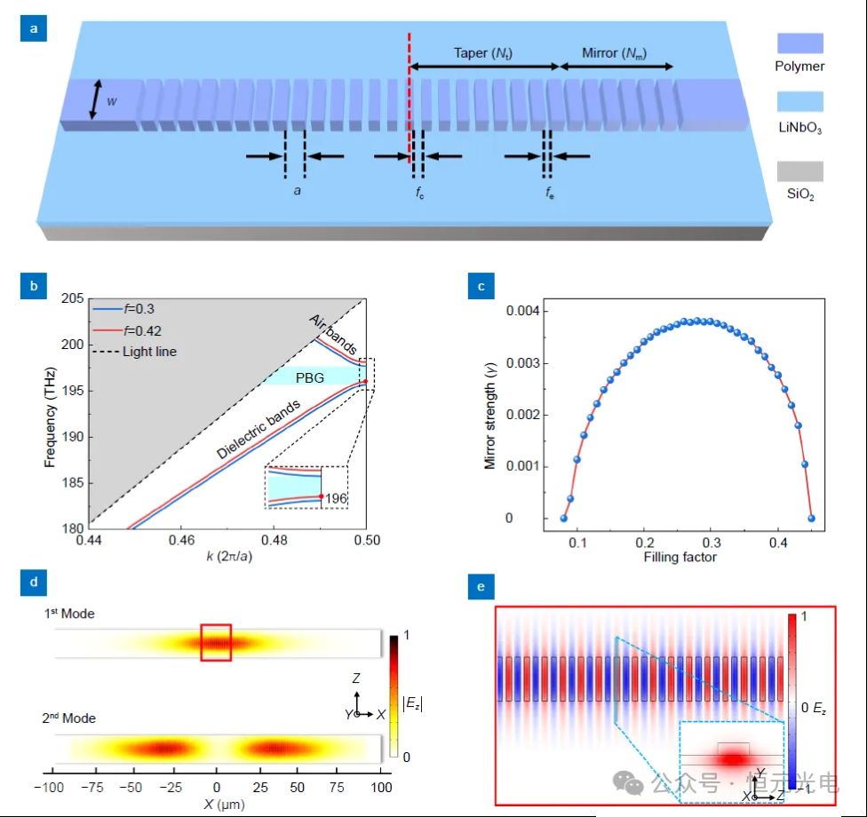 基于上述对波导模式和光损耗的讨论,该团队进一步研究了纳米腔内的损耗。如图2(a)所示,所提出的PCNBC由两个区域中的一系列电介质块构成,包括锥形和镜面,它们与红色虚线对称。图2(b)显示了TE00模式的频带图。选择0.3和0.42的填充系数,对应于最大镜强度和最小镜强度(见图2(c))。如图2(b)所示,在f=0.3时获得了光子带隙(PBG)(蓝色曲线)。当f为0.42时(红色曲线),介电带被拉入PBG。这意味着基本模式变成了离散模式。图2(d)显示了基模和二阶模高斯形电场能量分布的模拟结果。这表明该团队设计的PCNBC具有支持其他高阶谐振模式的能力。此外,如图2(e)所示,基模的电场分布平行于LN晶体的z轴。因此,它证实了PCNBC的光学模式是基于TE00模式。