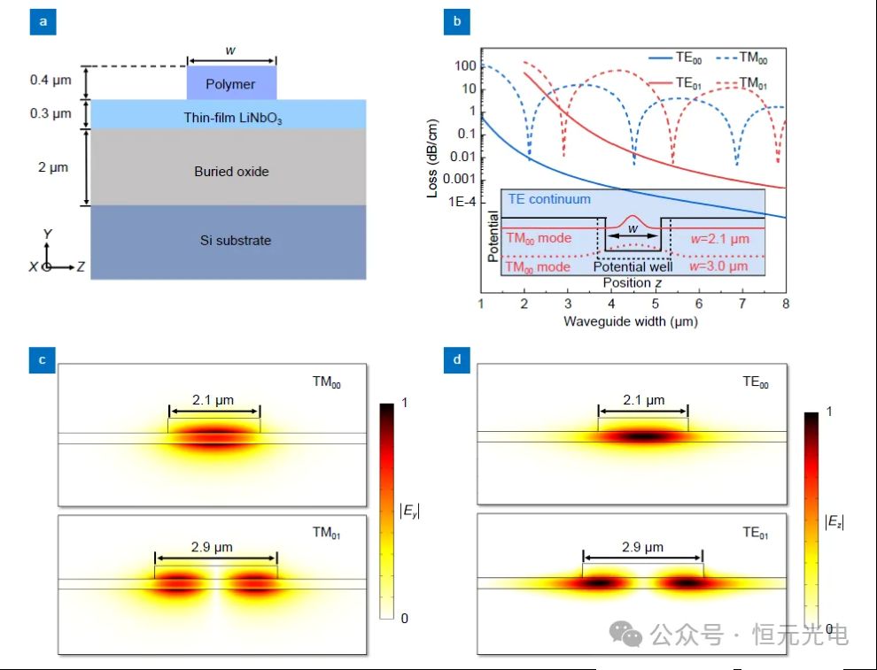 图1(a)描绘了放置在y切LNOI基板上的聚合物加载波导的横截面图。负载聚合物的厚度为0.4μm,宽度为w。为了获得最佳w,采用有限元法(FEM)对该波导的传播损耗进行建模。图1(b)显示了1550nm波长下不同模式的传播损耗与波导宽度w之间的关系。观察到TM模式在某些特定的波导宽度下表现出最小的损耗。这种行为可以从光子势的角度来解释,如图1(b)的插图所示。由于TM模式的势阱位于TE连续体内,TM模式的能量可以通过波导的边缘耦合到TE连续体中。通过调整w,可以通过耦合信道之间的相消干涉来消除耦合损耗。在这种机制中,由于势阱内更强的约束,TM模式在2.1μm的w处表现出比3.0μm更低的损耗。相比之下,对于TE模式,势阱具有最低的能量,并且不与LN衬底中的TE连续体耦合。因此,TE模式的传播损耗低且稳定,随着w的增加而降低。因此,与TM模式相比,TE模式具有鲁棒性。